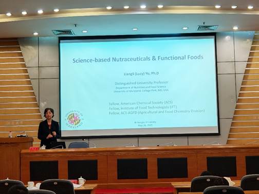 Professor Yu first systematically explained the fundamental concepts of nutraceutical and functional foods, analyzing their significance from the perspectives of human health needs and rural development strategies. She then highlighted the applications of multidisciplinary research in building a sustainable, safe, and healthy food system, sharing cutting-edge research findings and practical case studies. The lecture was well-structured, combining theoretical depth with practical relevance, and received enthusiastic responses from the audience. During the Q&A session, Professor Yu engaged in in-depth discussions with faculty and students on topics such as functional food development, food safety, and nutritional health, fostering a vibrant academic atmosphere.