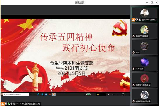 为更好地引导广大青年继承和发扬“爱国、进步、民主、科学”的五四精神,5月5日下午,食生学院本科生党支部和生技2101团支部联合开展“传承五四精神 践行初心使命”主题党日活动,活动以线上方式进行。