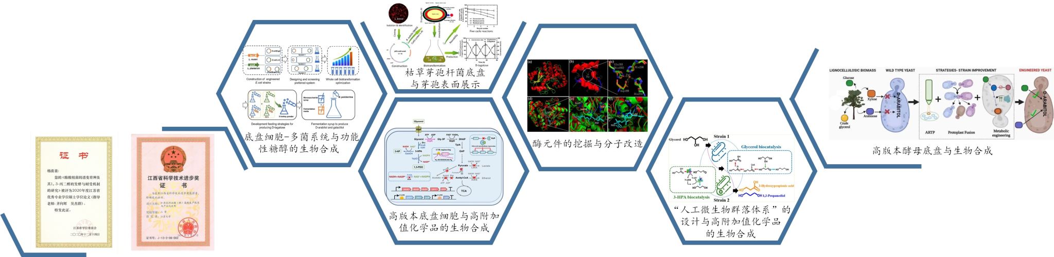 (7)高附加值化学品与功能性糖醇的微生物合成与智造,在功能微生物的筛选鉴定与工程菌开发、新酶挖掘与酶的定向进化和理性设计、底盘细胞设计与改造、微生物组学、生物转化与合成、发酵工程与工艺优化、代谢途径工程与分子机制解析、益生菌/益生元/合生元开发、纳米酶与纳米生物工程等。