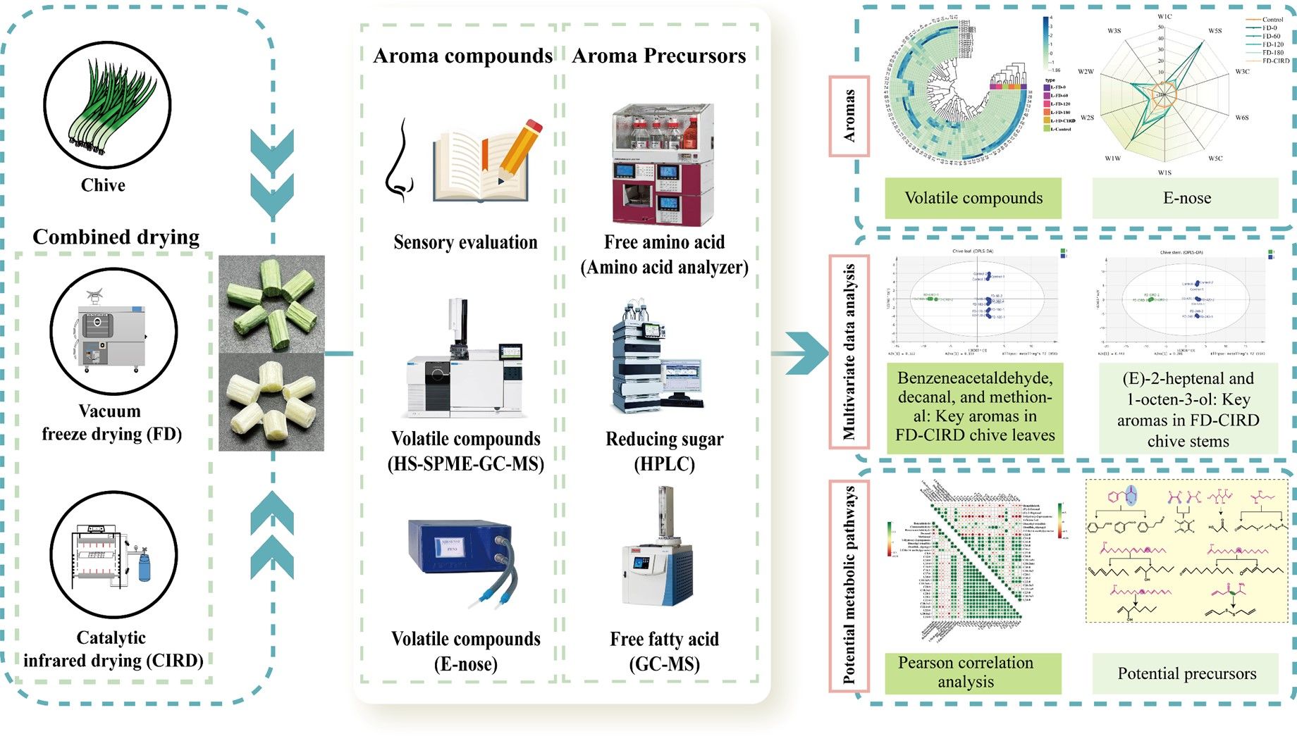 近日,江苏大学周存山教授课题组在国际食品领域TOP期刊Food Chemistry(2024年IF/JCR分区8.5/Q1)在线发表题为“Vacuum freeze drying combined with catalytic infrared drying to improve the aroma quality of chives: Potential mechanisms of their formation”的研究论文。bat365正版唯一官网22级硕士生韩静伊为该论文的第一作者,周存山教授为该文的通讯作者。