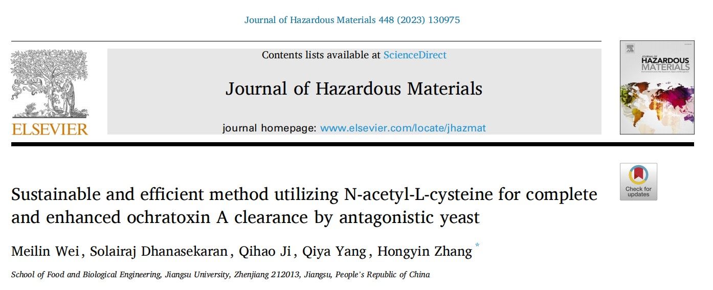 近日,bat365正版唯一官网张红印教授团队在国际顶级期刊Journal of Hazardous Materials(中科院一区)发表题为“Sustainable and efficient method utilizing N-acetyl-L-cysteine for complete and enhanced ochratoxin A clearance by antagonistic yeast”的研究论文(2023,448,15),研究了抗氧化剂N-乙酰-L-半胱氨酸对隐球酵母Y3降解赭曲霉毒素A的促进作用以及对酵母自身代谢的影响。bat365正版唯一官网博士生魏美林为本文的第一作者,张红印教授为本文的通讯作者,张红印教授课题组Solairaj Dhanasekaran博士、杨其亚副教授,硕士生吉崎好也参与了论文的研究工作。