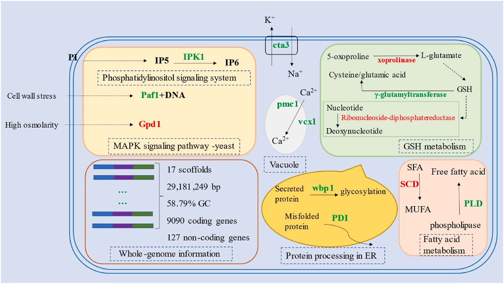 结果表明,C. podzolicus Y3的基因组信息得到了全面的注释,基因组大小为29,181,249 bp,scaffolds为17条。预测到9090个编码基因和127个非编码基因(见表1)。OTA处理明显改变了C. podzolicus Y3中的蛋白质表达变化,其中,谷胱甘肽代谢通路、磷脂酰肌醇信号通路和丝裂原活化蛋白激酶信号通路、钙离子稳态、内质网蛋白质加工和脂肪酸代谢途径中的蛋白质表达被明显改变(见表2和图1)。本论文为研究拮抗微生物的功能提供了理论基础。
