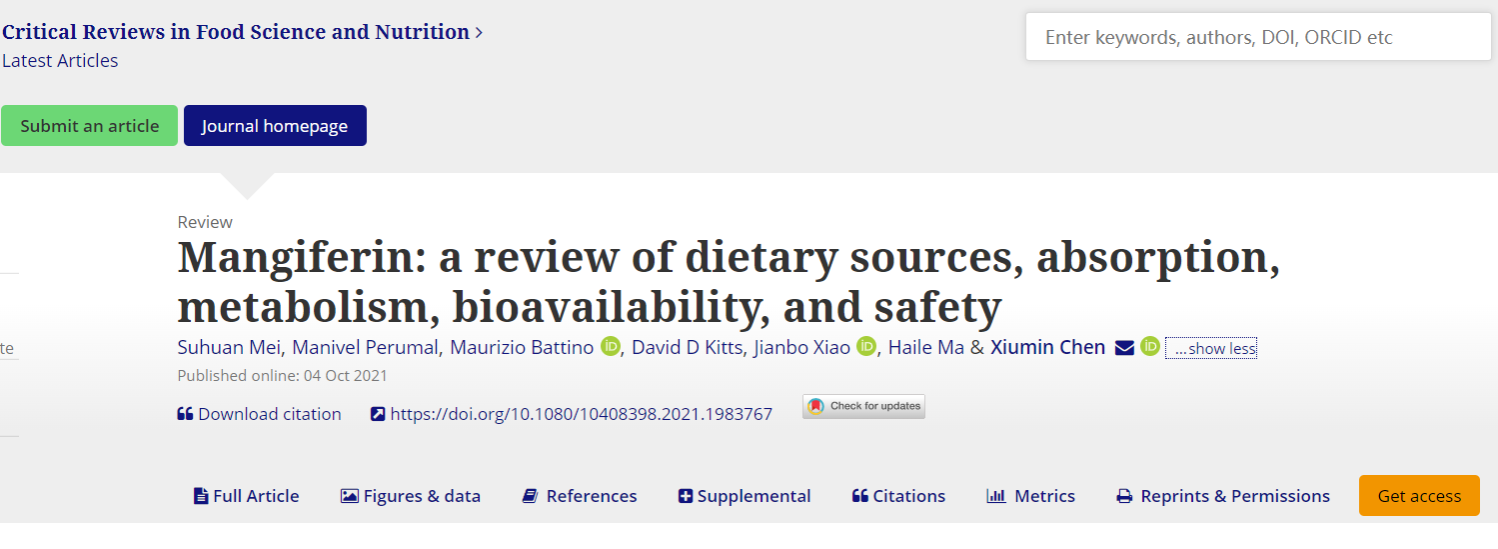 bat365正版唯一官网陈秀敏教授在国际食品领域顶级期刊Critical Reviews in Food Science and Nutrition在线发表题为“Mangiferin: a review of dietary sources, absorption, metabolism, bioavailability, and safety”的综述(https://doi.org/10.1080/10408398.2021.1983767),介绍了近年来芒果苷在吸收代谢方面的研究进展以及提高芒果苷溶解度和生物利用度的最新方法,讨论了影响芒果苷在食品中含量的因素以及利用纳米技术和联合用药等提高芒果苷生物利用度等新型生物专利技术。该成果已被《食品加 智食科技》公众号(https://mp.weixin.qq.com/s/nS363_2xdfajF5kKH9GAdA)推送,产生了较大的学术影响。本文的第一作者为bat365正版唯一官网2019级博士生梅素欢,江苏大学陈秀敏教授为本文的唯一通讯作者,博士后Manivel Perumal,Maurizio Battino教授,David D Kitts教授,肖建波教授和马海乐教授为共同作者。