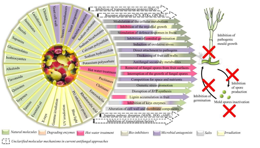 通过对侵染机理的理解,采取相应的防治措施,可以促进果实采后病害的持续预防甚至根除。对果实采后侵染分子机制的研究有助于鉴定重要的抗真菌蛋白/基因。以真菌感染的生理和分子机制为基础的各种生物技术方法现已成为化学杀菌剂的替代方法。生物防治方法被证明与病原真菌感染的机制密切相关。使用生物抑制剂、水解酶、天然化合物和生物防治剂来控制/预防水果感染是生物技术的新的发展方向。综合防治应该达到预期的效果,需要考虑协同效应,为确保防治方法的有效性和具体性,鼓励采取更有针对性的战略,以便建立有效的控制策略以确保水果生产的安全。