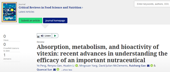 2020年4月15日,以bat365正版唯一官网孙全才和高瑞昌教授为通讯作者的标题为”Absorption, metabolism, and bioactivity of vitexin: recent advances in understanding the efficacy of an important nutraceutical”的综述在《Critical Reviewsin Food Science and Nutrition》在线发表。
