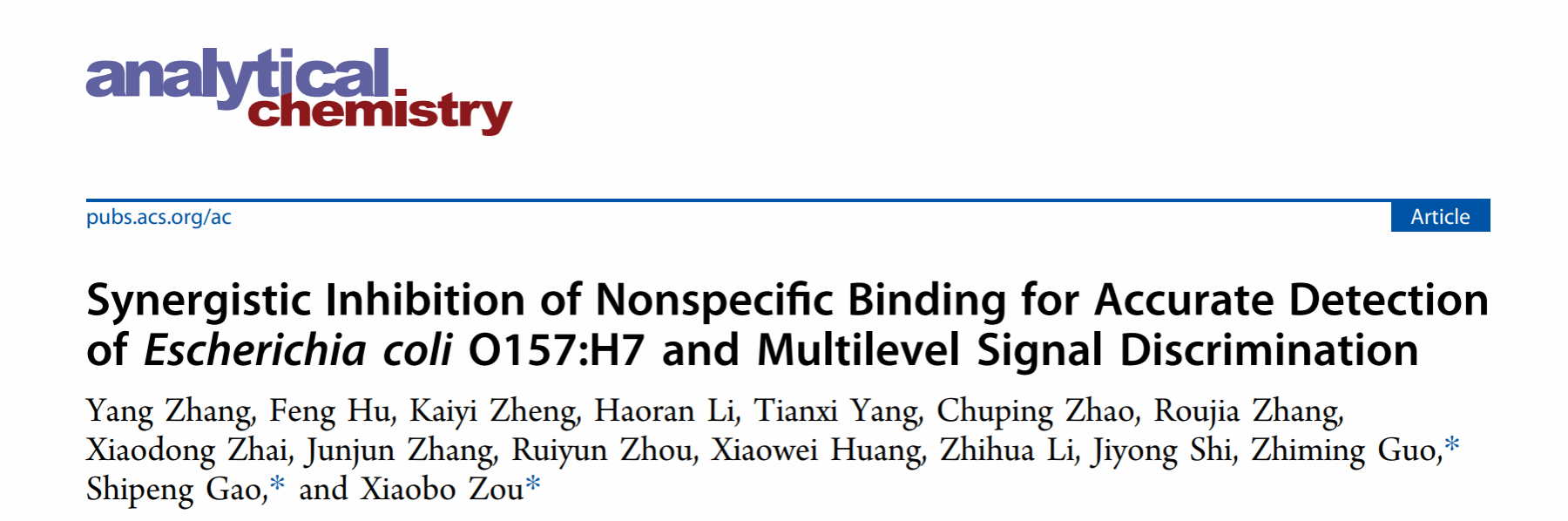 近日,江苏大学邹小波教授课题组在国际食品领域TOP期刊Analytical Chemistry上发表题为“Synergistic Inhibition of Nonspecific Binding for Accurate Detection of Escherichia coli O157:H7 and Multilevel Signal Discrimination”的研究论文。我院硕士生导师张钖为该论文的第一作者,其学生胡凤为二作,邹小波教授、郭志明教授和高士鹏副教授为该文的通讯作者。