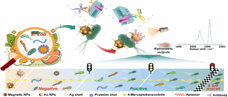 本研究开发了一种基于等离子体纳米结构的新型生物传感器,用于食品中 大肠杆菌O157:H7高特异性检测。通过在纳米粒子表面功能化靶向大肠杆菌 O157:H7 两个不同表位识别元件,并整合静默区拉曼信号分子实现比率信号输出,最后结合磁富集技术提高选择性。该研究首次定量表征和归一化各类非目标菌株的干扰水平建立明确的信号阈值,有效区分真阳性与假阳性信号。创新性地解决了现有生物传感器在区分亲缘关系密切的大肠杆菌菌株方面的关键局限性,为食品安全领域的病原体监测工作,提供了一种极具应用前景的诊断工具